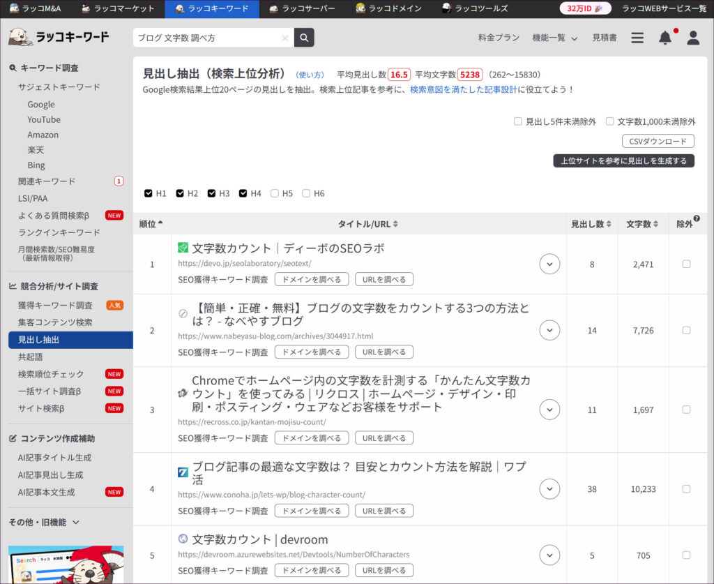 サイトにアクセスし、「見出し抽出」機能で調査したいキーワードを入力して検索すると、そのキーワードで上位表示されているサイトの見出し構成と、各記事の文字数が一覧で表示されます。この機能を使えば、誰でも数分で競合の平均文字数を把握できます。